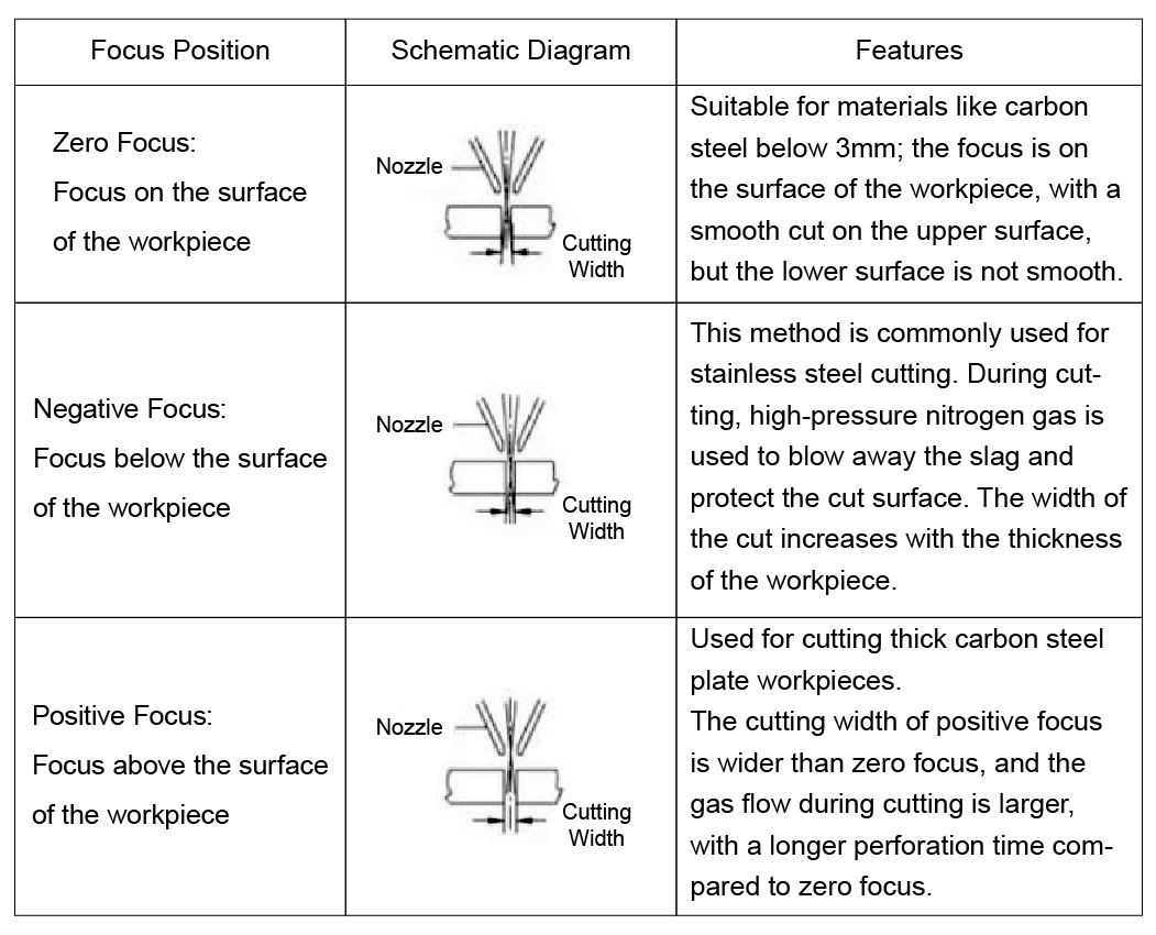 ໂດຍການເລືອກຕໍາແຫນ່ງຈຸດສຸມທີ່ເຫມາະສົມ, ປະສິດທິພາບການຕັດເລເຊີແລະຄຸນນະພາບສາມາດໄດ້ຮັບການປັບປຸງທີ່ຖືກປັບປຸງສໍາລັບວັດສະດຸໂລຫະທີ່ແຕກຕ່າງກັນ. ທາງເລືອກຂອງຈຸດສຸມໃນທາງບວກ, ຈຸດສຸມໃນແງ່ລົບ, ຫຼືຈຸດສຸມຂອງສູນແມ່ນຖືກກໍານົດໂດຍຕົ້ນຕໍໂດຍຄວາມຫນາ, ຄວາມຫນາ, ຄວາມຮ້ອນ, ການປະຕິບັດຄວາມຮ້ອນ, ແລະຄວາມສະຫວ່າງຂອງວັດສະດຸ. ໃນພາກປະຕິບັດ, ຕໍາແຫນ່ງຈຸດສຸມທີ່ຖືກຕ້ອງຮັບປະກັນຄວາມເລິກຂອງການຕັດທີ່ລຽບງ່າຍ, ແລະເຂດທີ່ຖືກກະທົບຮ້ອນ, ແລະຜົນໄດ້ຮັບທີ່ສຸດໃນການປະຕິບັດການປຸງແຕ່ງທີ່ດີທີ່ສຸດ.