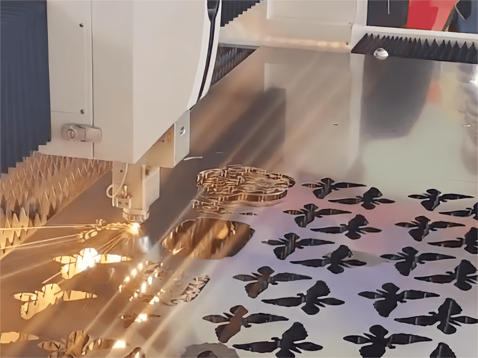 ການຕັດແຜ່ນແຜ່ນຂະຫນາດກາງແລະຫນາ:ສໍາລັບຈານທີ່ຫນາປານກາງ, ທັງສອງຈຸດສຸມໃນແງ່ບວກແລະຈຸດສຸມໃນແງ່ລົບສາມາດໃຊ້ໄດ້. ຈຸດບວກໃນທາງບວກຮຽກຮ້ອງໃຫ້ມີພະລັງງານເລເຊີທີ່ພຽງພໍແລະຄວາມກົດດັນຂອງອາຍແກັສຊ່ວຍ. ໃນເວລາທີ່ໃຊ້ຈຸດສຸມໃນແງ່ລົບ, ຈຸດສຸມແມ່ນປົກກະຕິຢູ່ໃນລະດັບ 1/3 ເຖິງ 1/2 ຂອງຄວາມຫນາຂອງແຜ່ນ, ໃຫ້ການຕັດທີ່ຫມັ້ນຄົງແລະຫຼຸດຜ່ອນຄວາມຫຍາບຄາຍຢູ່ເທິງຫນ້າຕັດ.